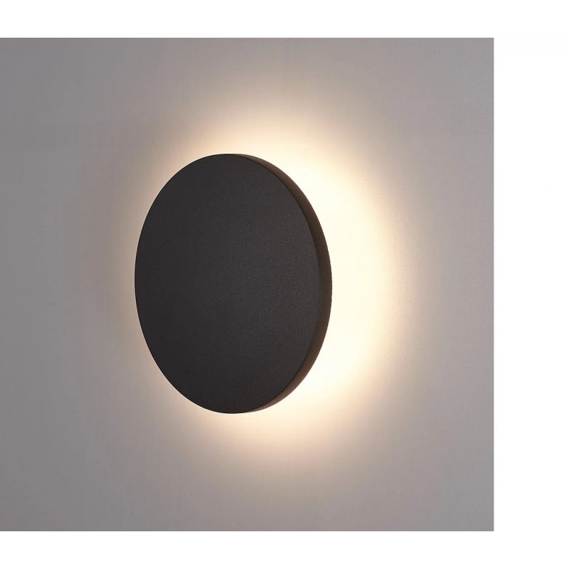 Esta lámpara de pared redonda es negra por delante y se ilumina por detrás. Diámetro: 15 cm. Longitud del cable: 30 cm. Material: aluminio + PMMA. Color: negro.800Lm, Φ150mmX15mm