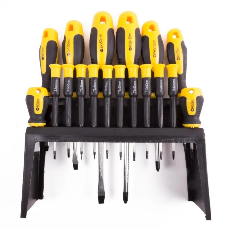 Juego de 18 destornilladores estándar, aptos para montaje en pared. Con punta magnética y mango ergonómico. Material: Cr-V y plástico. Contenido: 4 destornilladores planos: 5 x 75 mm, 6 x 100 mm, 8 x 150 mm y 6 x 38 mm; 4 destornilladores Phillips: PH1 x 75 mm, PH2 x 100 mm, PH3 x 150 mm y PH2 x 38 mm; 2 destornilladores planos de precisión: 2,5 x 50 mm y 3,0 x 50 mm; 2 destornilladores Phillips de precisión: PH00 x 50 mm y PH0 x 50 mm; 6 destornilladores Torx de precisión: T5, T6, T7, T8, T9 y T10 x 50 mm.